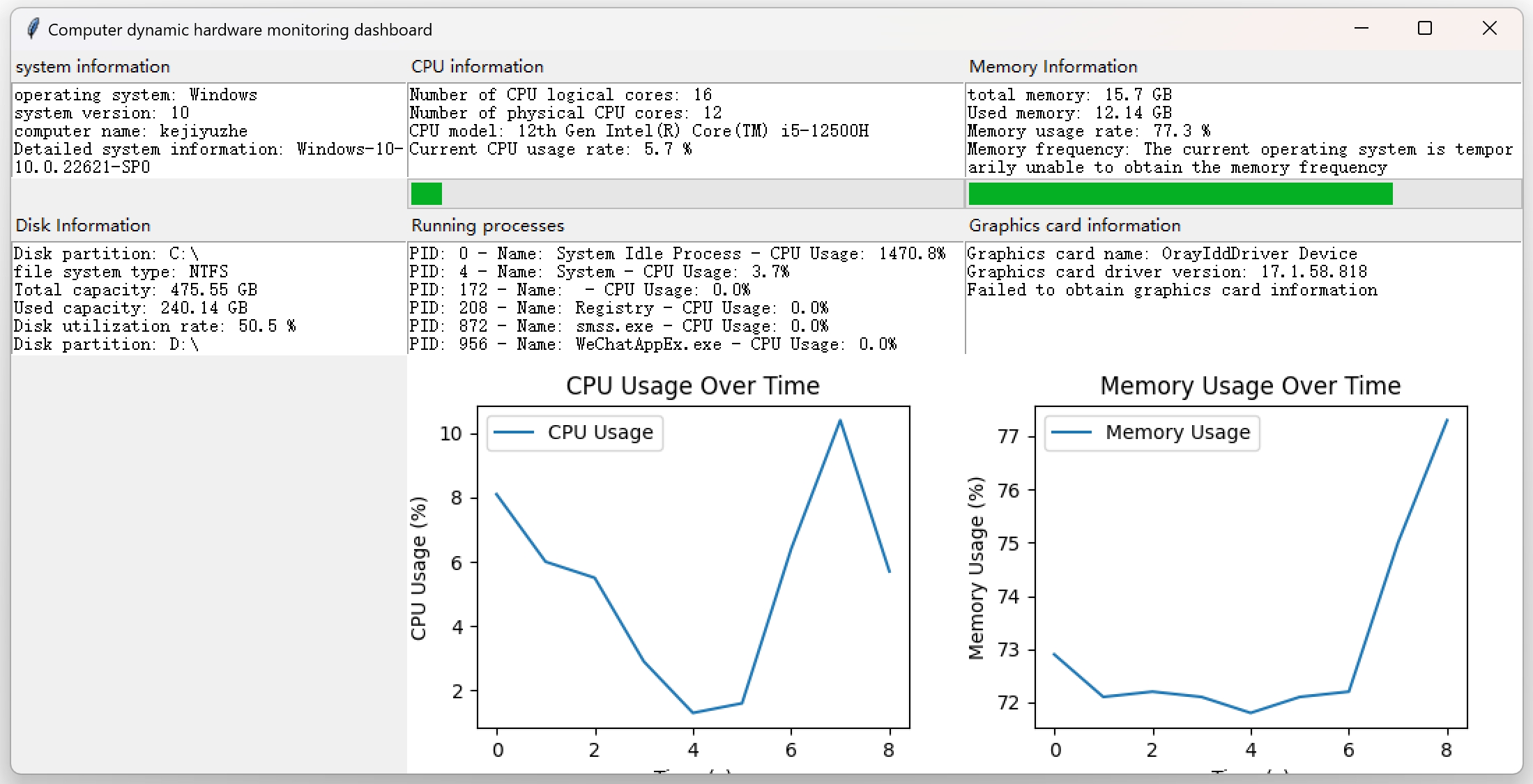 tkinter: Python's standard GUI (graphical user interface) library, used to create intuitive and easy-to-use graphical interfaces, implement interface layout, component display, and interactive functions, providing a visual operation window for the entire project.psutil: A cross platform library that enables easy access to various information about computer systems and processes, such as data on CPU, memory, disk, processes, etc., providing core data acquisition support for the hardware information monitoring function of this project.matplotlib: A powerful plotting library that combines thematplotlib.backends.backend_tkaggmodule to embed pre drawn charts into thetkinterinterface for visual display of CPU and memory usage, presenting data trends in intuitive chart form.subprocess: Used to execute external system commands in Python programs, playing a role in obtaining some hardware information (such as CPU model, memory frequency, etc. under different operating systems), by calling system commands and processing the returned results to obtain the required data.platform: Python's built-in standard library is used to obtain basic information related to the system, such as operating system name, version, etc., providing a basic data source for displaying system information.wmi(Used under Windows system): In the Windows environment, this library can access Windows Management Instrumentation (WMI) to obtain detailed information about hardware devices such as graphics cards. It is a key dependency for implementing graphics card information monitoring function under Windows system.